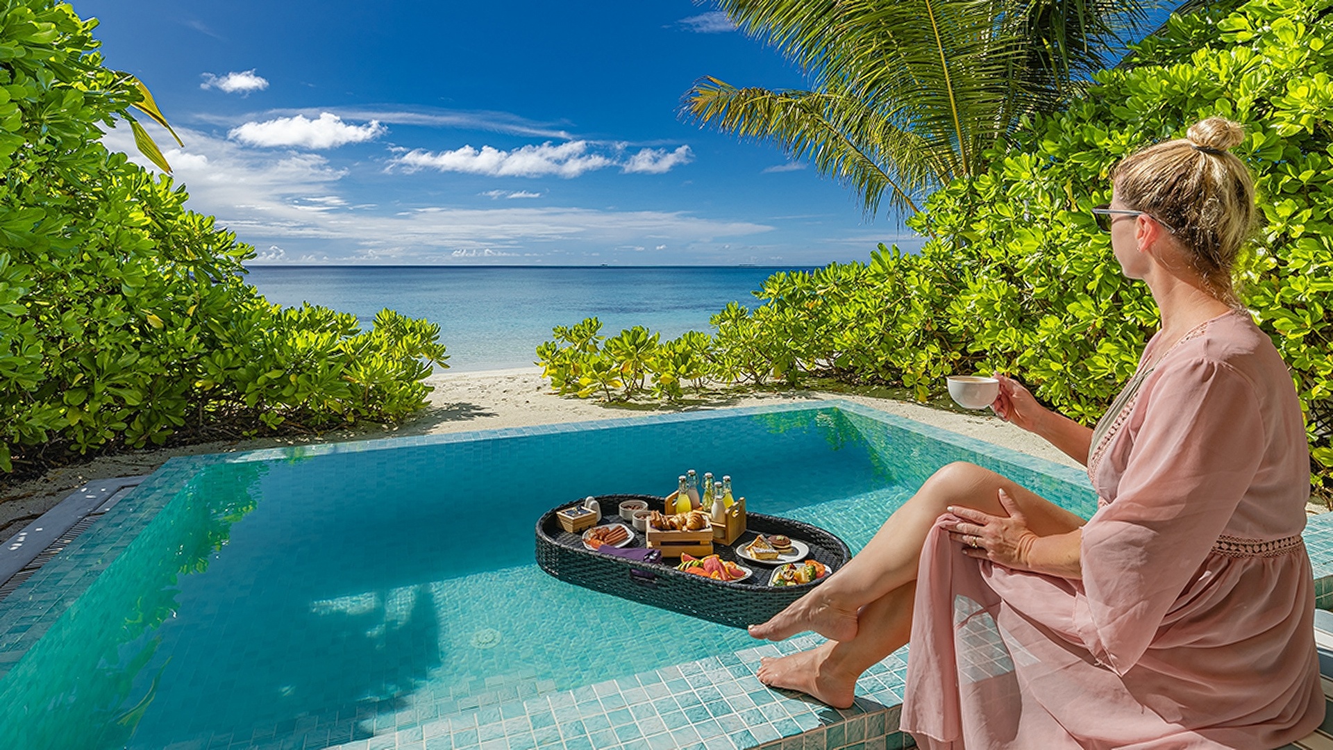 Enjoy a pleasant sunset tea party during the golden hour at the resort. As a part of the resort's all-inclusive package, guests can enjoy a pleasant high tea experience with a variety of refreshments at the hotel's poolside Positive Energy Bar offering breathtaking sunset views.
